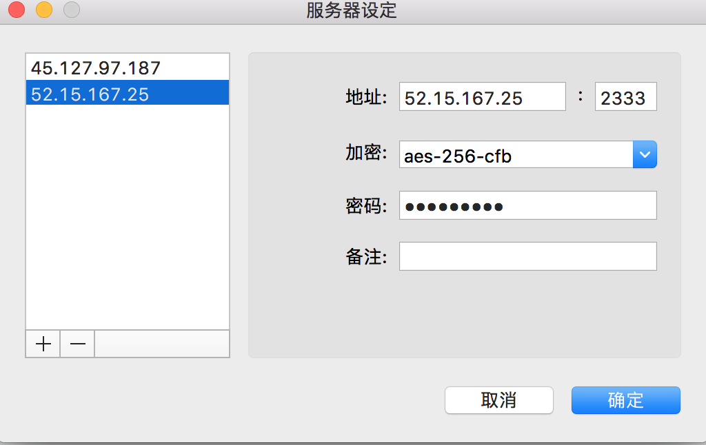 "method":"aes-256-cfb",//加密方式